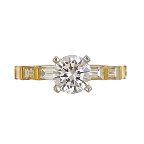 This refined engagement ring features a round center diamond complemented by six baguette diamonds set halfway down the shank. The clean, geometric lines of the baguette accents contrast beautifully with the round center, creating a timeless balance of brilliance and elegance.