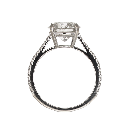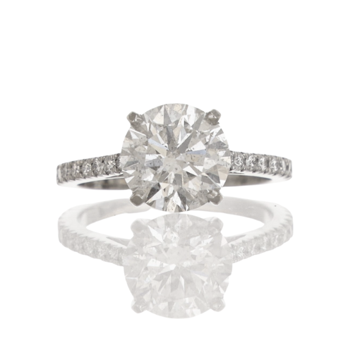 This platinum engagement ring showcases a round brilliant center diamond set in a classic prong design. The band features subtle diamond accents along the shank, adding refined sparkle while keeping the focus on the radiant centerpiece. Crafted in platinum, this timeless setting embodies elegance and enduring strength.