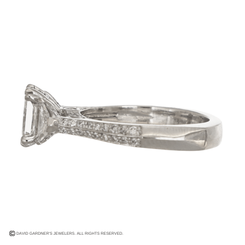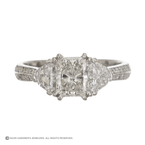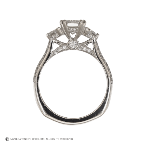 Crafted in platinum, this elegant three-stone engagement ring is designed to feature a striking emerald-cut center stone. Two trapezoid diamond side stones frame the center, creating a balanced and timeless silhouette. Additional round diamonds are set along the shank for an added touch of sparkle. A sophisticated and enduring design, perfect for celebrating life’s most meaningful moments.