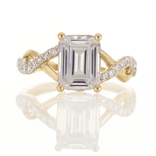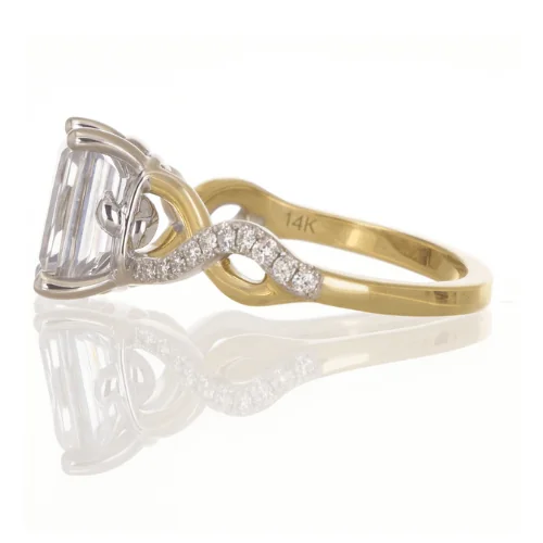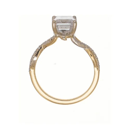 Romantic and nature-inspired, this 14K yellow gold engagement ring is designed to feature a emerald cut center diamond. The twisted shank adds graceful movement, while delicate leaf motif detailing in the gallery creates a touch of organic elegance. A beautiful choice for those who love timeless design with a natural twist.