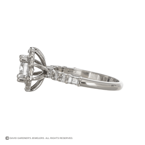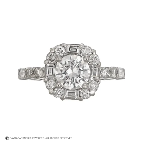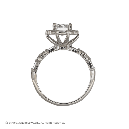This 14K white gold halo engagement ring is designed to showcase a brilliant round center stone of your choice. Surrounding the center, a dazzling halo of baguette and round diamonds creates a radiant frame with exceptional sparkle. The timeless halo style is elevated with a blend of diamond cuts, giving the ring a unique and refined look. A perfect balance of elegance and brilliance.