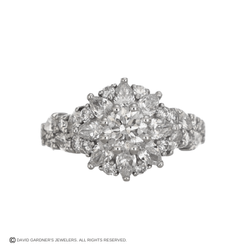 – Round center accented by alternating pear and round diamonds in a floral-inspired halo