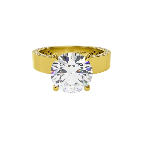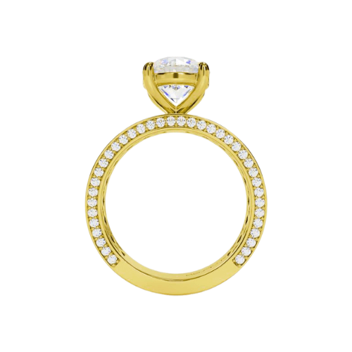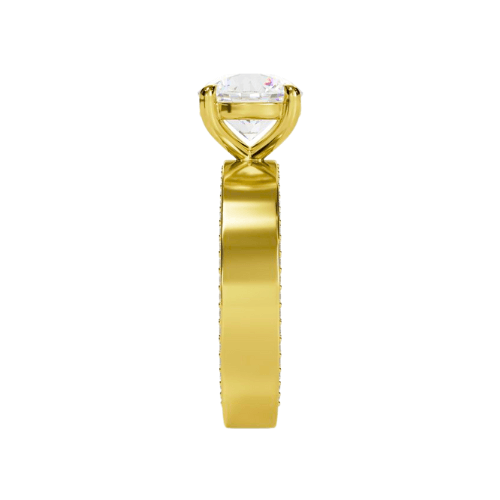 This 14K yellow gold engagement ring offers a timeless solitaire design with an elegant surprise. While the center stone remains the focal point, delicate diamond accents are set into the profile of the mounting, adding hidden sparkle that’s revealed from side views. A perfect blend of classic beauty and subtle detail, this ring provides a sophisticated stage for your chosen center diamond.