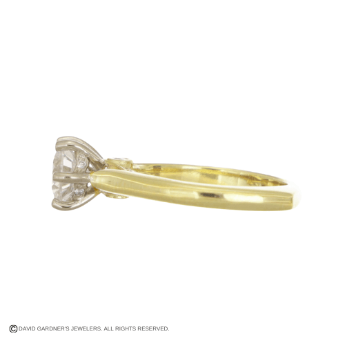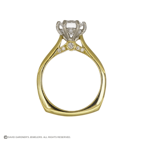 This two-tone custom engagement ring pairs 18K yellow gold with 14K white gold for a timeless contrast. The solitaire design is accented with delicate diamonds along the gallery, adding a subtle sparkle visible from the side view. Crafted to feature your chosen round center diamond, this setting blends classic elegance with thoughtful detail.