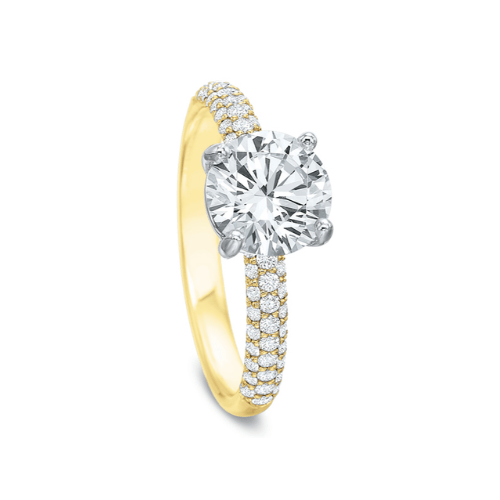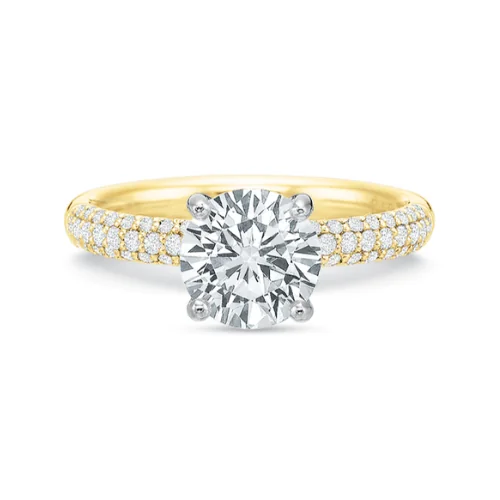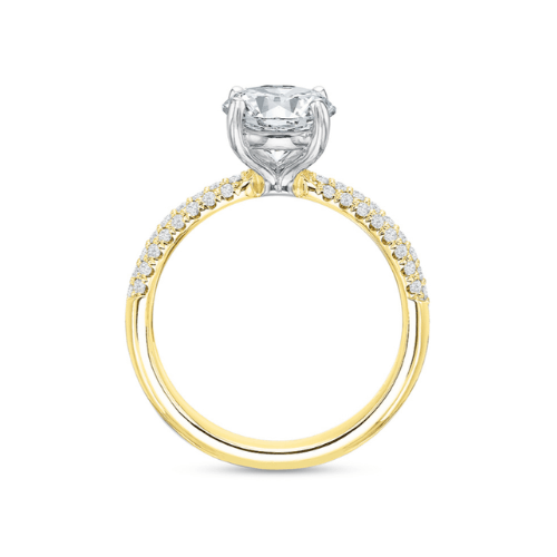 This 14K yellow gold engagement ring showcases a striking three-row pavé design, with diamonds set halfway down the shank for added brilliance. The platinum head enhances durability and provides a secure foundation for the featured center stone. Elegant and bold, this ring blends classic style with modern sparkle for a truly radiant look.