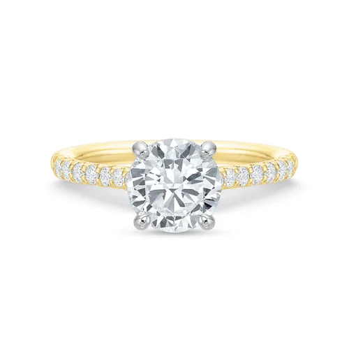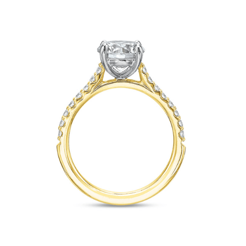 This 14K yellow gold engagement ring features a classic shared prong design with diamonds set halfway down the band, creating a timeless look with added brilliance. The clean and elegant style allows the featured center stone to remain the focal point while adding just the right amount of sparkle.