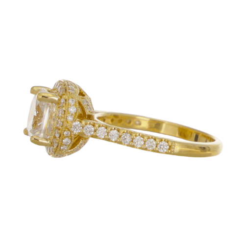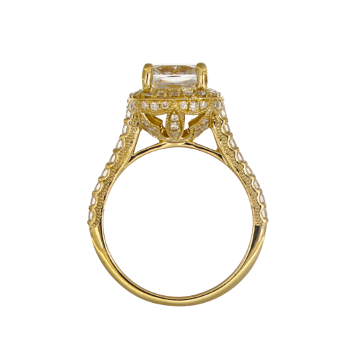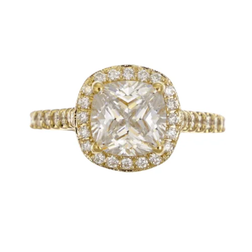 This romantic engagement ring features a cushion-shaped halo that beautifully frames your chosen center diamond. The intricate vintage-inspired basket and milgrain detailing add a touch of old-world charm, while the polished 14K yellow gold setting enhances the warmth and brilliance of the design. A perfect balance of elegance and craftsmanship, this ring captures timeless beauty with a hint of vintage character.
