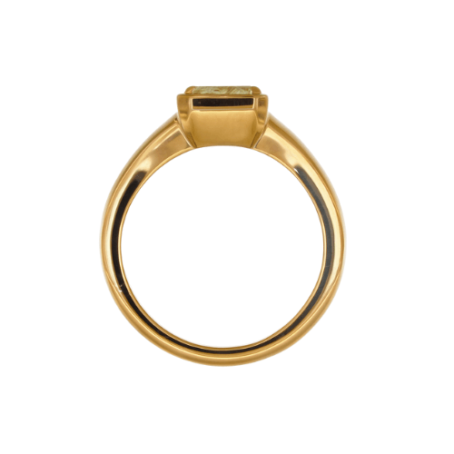 This distinctive engagement ring showcases a vibrant fancy yellow radiant-cut diamond set in a smooth bezel of 18K yellow gold. The sleek, modern setting enhances the diamond’s warm golden hue while offering a secure, polished frame that emphasizes its brilliance. A bold yet elegant design, this ring beautifully blends contemporary style with timeless sophistication.